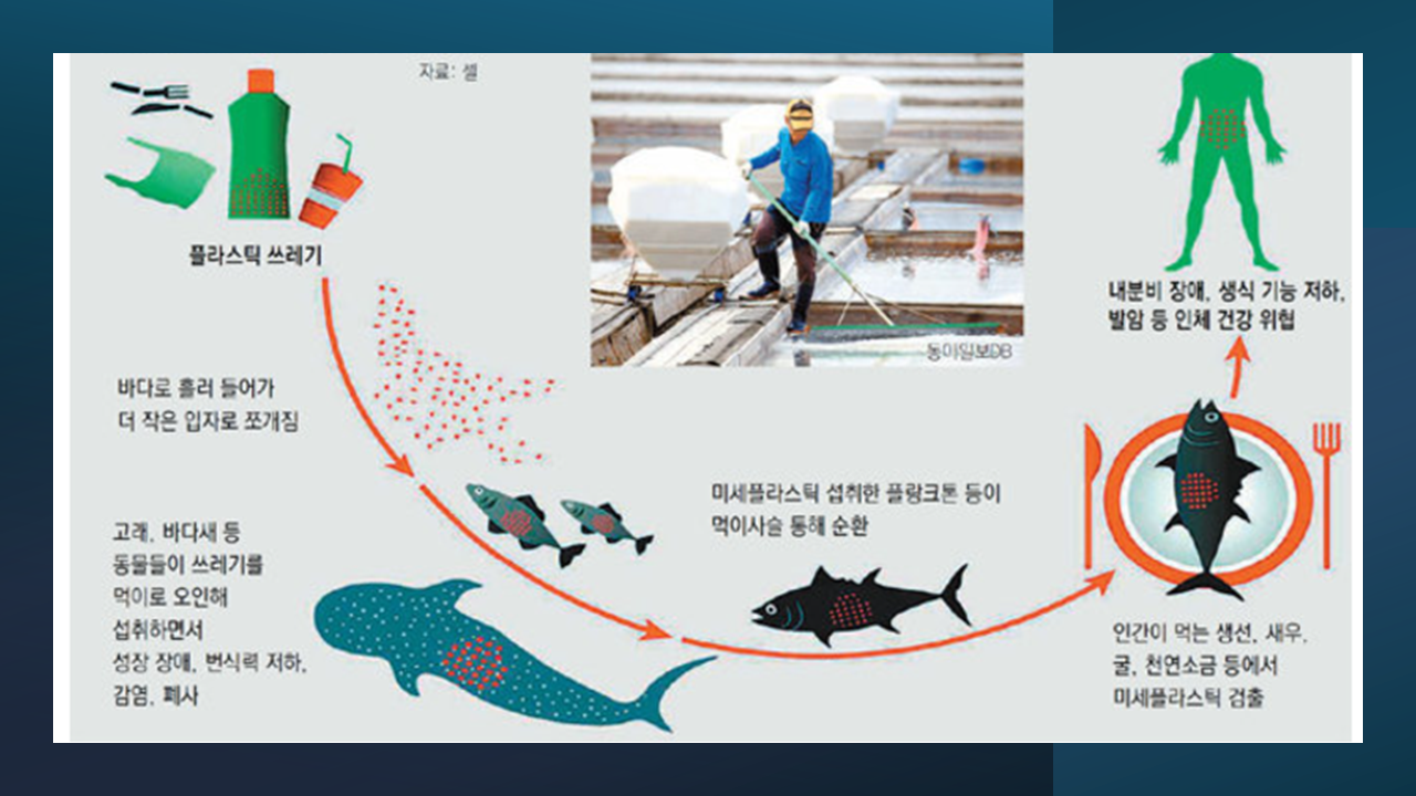 결과적으로 바다로 흘러들어간 미세 플라스틱은 수백 년간 바닷 속을 돌아다니며 먹이사슬을 타고 우리들 저녁 식탁에 올라오고 있다는 것입니다. 사람들은 이러한 연결고리를 잘 모르고 있다는 걸 알게 되었어요.