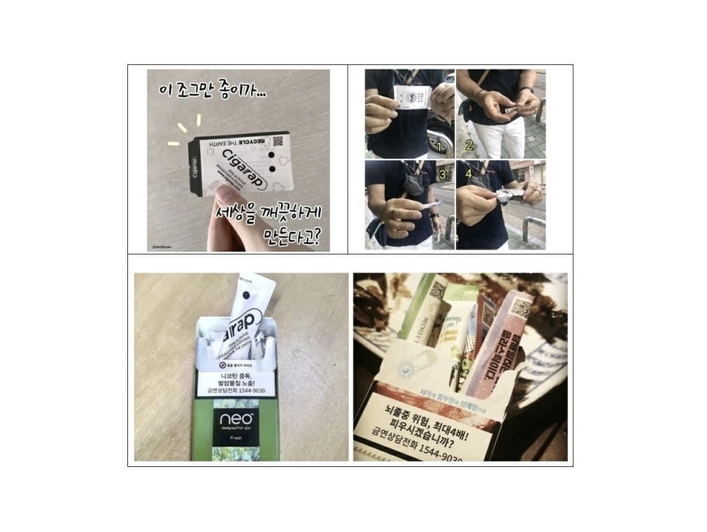: 깨끗한 꽁초처리를 위해 시가랩에서 꽁초랩을 무료로 나누어주고 있습니다.