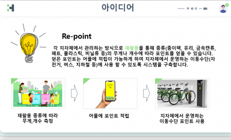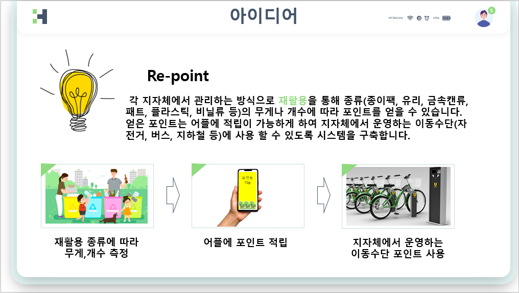 저희는 사람들이 자발적으로 참여할 수 있는 방법이 무엇이 있을까 먼저 고민했습니다. 프로젝트를 진행한다 해도 동참하지 않으면 소용이 없다고 생각했기 때문입니다. 그래서 올바른 분리수거에 참여하면 일정 보상을 지급하면 어떨까 라는 생각에서 시작됐습니다. 우선 각 지자체와 협력하여 각 동의 주민센터나 주변 주민이 모일 수 있는 장소에 재활용품을 체크하고 관리할 수 있는 시설과 인원을 배치하고 재활용품의 종류(종이팩, 유리, 금속캔류, 패트, 플라스틱, 비닐류 등)의 무게나 개수에 따라 포인트를 지급합니다. 이렇게 얻은 포인트는 어플에 적립이 가능하게 하여 손쉽게 포인트 적립 현황을 확인할 수 있고 이를 지자체에서 운영하는 이동수단(자전거, 버스, 지하철 등)에 사용 할 수 있도록 시스템을 구축합니다.