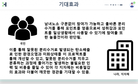 이를 통해 잘못된 분리수거로 발생되는 탄소배출로 인한 환경오염과 미화상태를 이 프로젝트를 통해 개선할 수 있고, 잘못된 분리수거를 치우고 분류하는 과정에 들어가는 발생하는 불필요한 인력 및 비용을 줄일 수 있어 각 지자체는 비용절감의 효과와 더불어 깨끗한 경관을 기대할 수 있을 것입니다. 이러한 노력은 결국 더 많은 양질의 재활용품을 생산할 수 있을것이고 탄소중립에 긍정적인 발자취를 남길 수 있을 것이라 생각합니다.